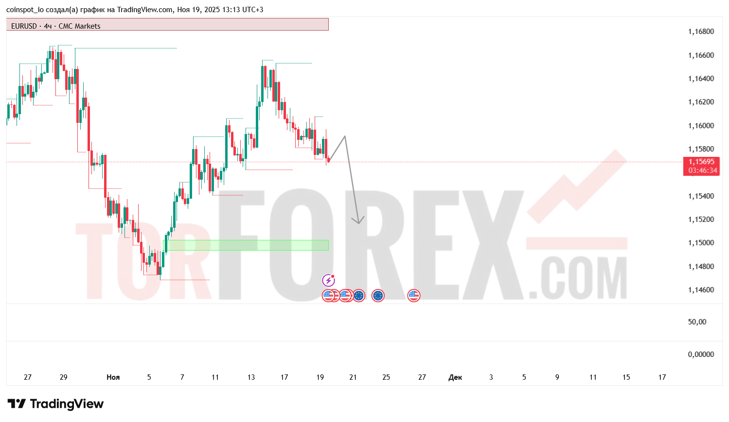 - Медвежий сценарий (основной): удержание под 1.1595 → пробой 1.1545 откроет путь к 1.1510 (нижняя FVG / локальный минимум). Продолжение под 1.1510 приведёт к более глубокой коррекции в зону 1.1470–1.1450. Условия подтверждения: RSI < 42, растущая отрицательная MACD‑гистограмма, цена под EMA50/100.