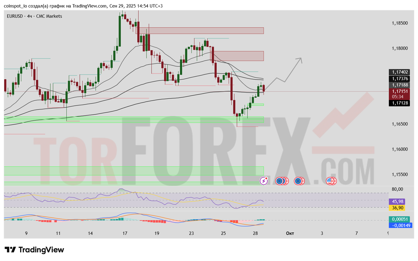 • Бычий сценарий: Реализуется при успешной обороне уровня 1.17128 и последующем пробое сопротивления 1.17402. Это может активизировать движение к следующим целям в районе 1.18000. Ключевым условием является закрепление выше локальных максимумов при поддержке возрастающих объемов.