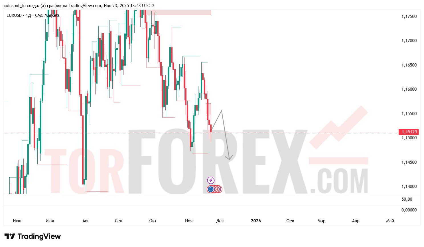 - Нижняя FVG: 1.1450–1.1400 USD — потенциальная зона притяжения при продолжении снижения