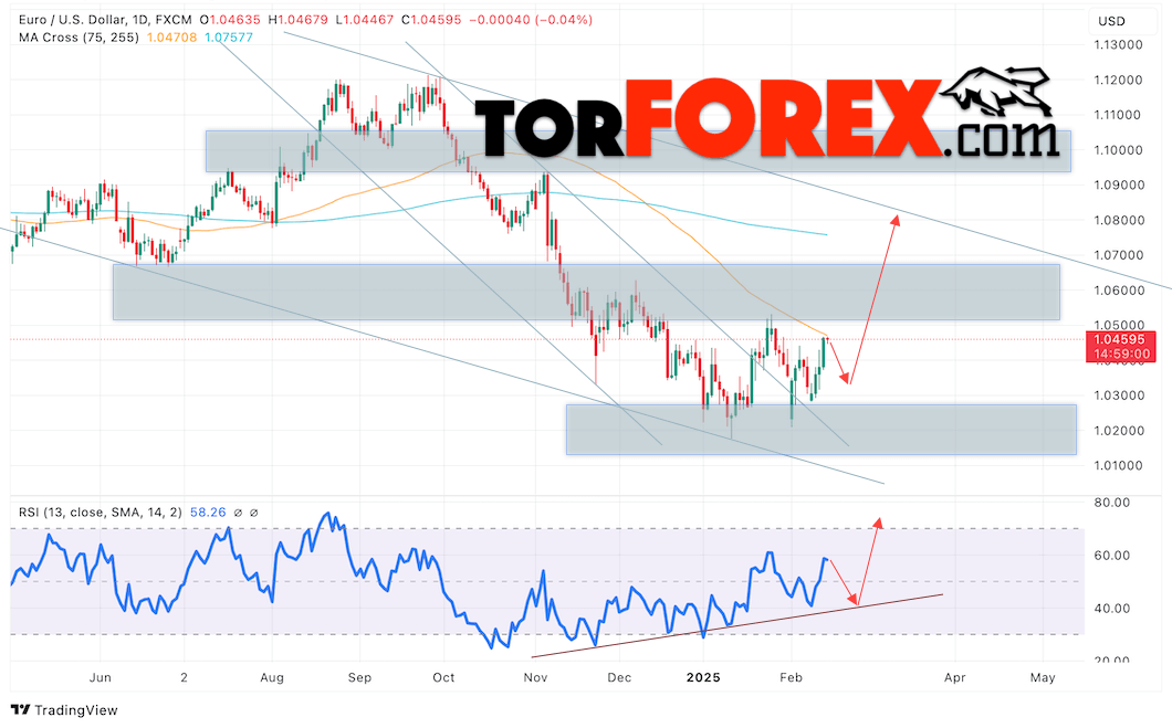 Таким образом, EUR/USD прогноз на неделю 17 — 21 февраля 2025 предполагает попытку развития медвежьей коррекции пары и тест области поддержки вблизи уровня 1.0315. Откуда стоит рассматривать очередной отскок цены пары Евро Доллар вверх и попытку продолжения роста на рынке в область выше уровня 1.0785. Дополнительным сигналом в пользу подъёма инструмента Форекс выступит тест линии тренда на индикаторе относительной силы (RSI). Отменой варианта роста пары EUR/USD станет падение котировок и пробой уровня 1.0135. Это укажет на пробой области поддержки и продолжение падения валютной пары в область ниже уровня 0.9825.