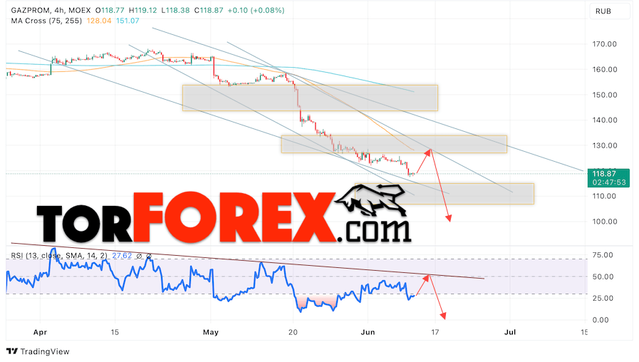 Дополнительным сигналом в пользу снижения котировок GAZP выступит тест нисходящей линии тренда на индикаторе относительной силы. Вторым сигналом выступит отбой от уровня сопротивления на графике цены. Отменой варианта снижения стоимости акций Газпром станет сильный рост и пробой уровня 135. Это укажет на пробой области сопротивления и продолжение роста котировок в область выше уровня 160. Ожидать подтверждения падению котировок GAZP стоит с пробоем области поддержки и закрытием ниже уровня 1115.