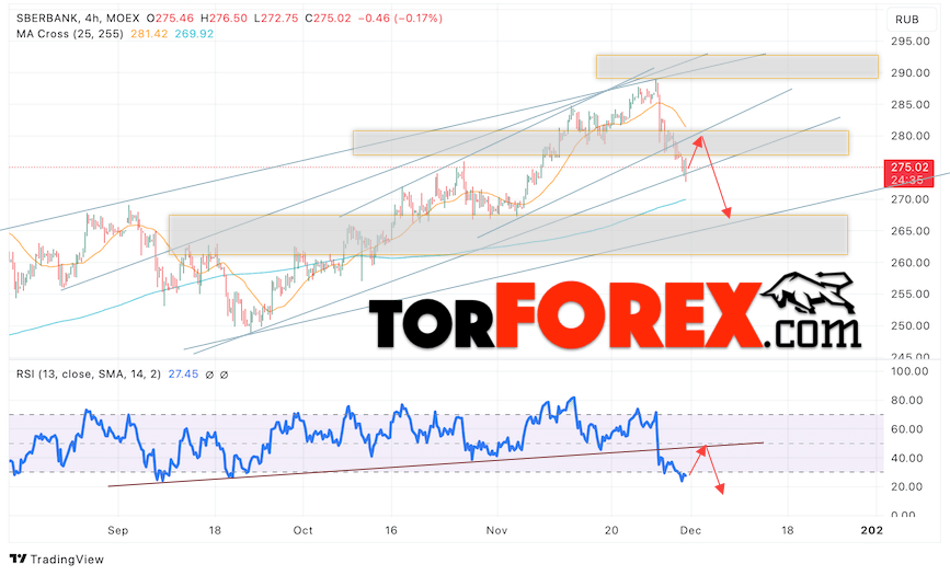 Котировки акций Сбербанк торгуется на уровне 275. Бумага продолжает движение в рамках падения и покинули пределы бычьего канала. Скользящие средние указывает на наличие бычьей тенденции по акциям компании. Цены вновь тестируют область между скользящими средними, что указывает на давление со стороны покупателей бумаг и потенциальное продолжение роста цены акций уже с текущих уровней. В рамках прогноза курса и стоимости Сбербанк на 1 декабря 2023 стоит ожидать попытку развития бычьей коррекции стоимости бумаг и тест уровня сопротивления вблизи области 278. Откуда стоит ожидать отскок вниз и продолжения падения курса акций Сбербанк с целью ниже уровня 265.