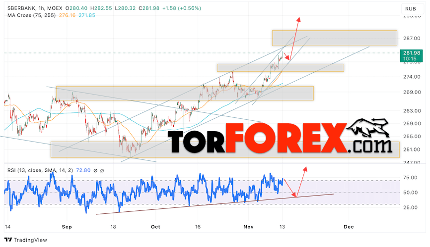 Котировки акций Сбербанк торгуется на уровне 281. Бумага продолжает движение в рамках роста и бычьего канала. Скользящие средние указывает на наличие бычьей тенденции по акциям компании. Цены пробили область между скользящими средними вверх, что указывает на давление со стороны покупателей бумаг и потенциальное продолжение роста цены акций уже с текущих уровней. В рамках прогноза курса и стоимости Сбербанк на 14 ноября 2023 стоит ожидать попытку развития медвежьей коррекции стоимости бумаг и тест уровня поддержки вблизи области 280. Откуда стоит ожидать отскок вверх и продолжения роста курса акций Сбербанк с целью выше уровня 295.