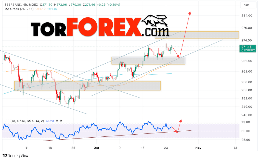 Дополнительным сигналом в пользу роста котировок SBER выступит тест линии поддержки на индикаторе относительной силы (RSI). Вторым сигналом выступит отбой от нижней границы бычьего канала. Отменой варианта роста стоимости акций Сбербанк станет падение стоимости бумаг и пробой уровня 260. Это укажет на пробой нижней границы бычьего канала и продолжение падения акций в область ниже уровня 245. Ожидать подтверждения росту котировок SBER стоит с пробоем области сопротивления и закрытием выше уровня 275.