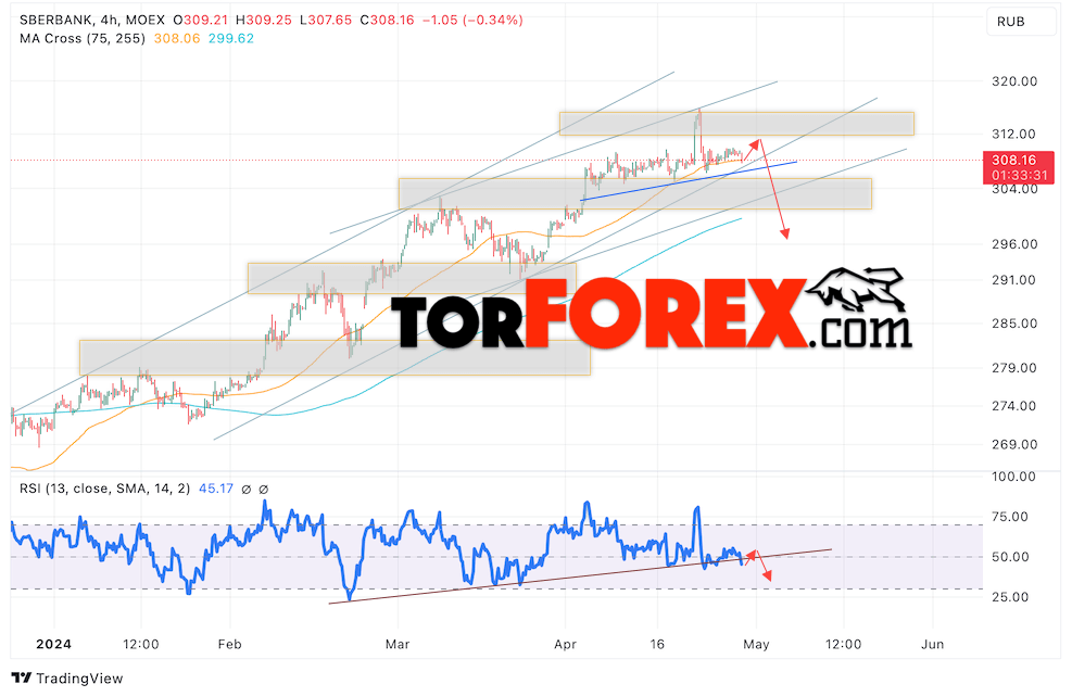 Дополнительным сигналом в пользу снижения котировок SBER выступит тест линии сопротивления на индикаторе относительной силы (RSI). Вторым сигналом выступит отбой от верхней границы разворотной модели «Голова и плечи». Отменой варианта падения стоимости акций Сбербанк станет сильный рост стоимости бумаг и пробой уровня 320. Это укажет на пробой сопротивления и продолжение роста акций в область выше уровня 345. Ожидать подтверждения падению котировок SBER стоит с пробоем области поддержки и закрытием ниже уровня 295, что укажет на пробой нижней границы разворотной модели и начало отработки паттерна с целями внизу.