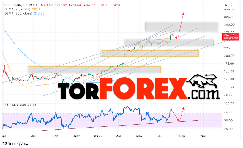 Таким образом, Акции Сбербанк прогноз на 7 — 11 августа 2023 предполагает попытку теста области поддержки вблизи уровня 245.55. Далее, продолжение роста котировок SBER с целью выше уровня 325.05. Отменой варианта роста цены акций Сбербанк выступит падение и пробой уровня 230.05. Это укажет на пробой нижней границы бычьего канала. В этом случае стоит ожидать продолжения снижения к уровню 195.05.