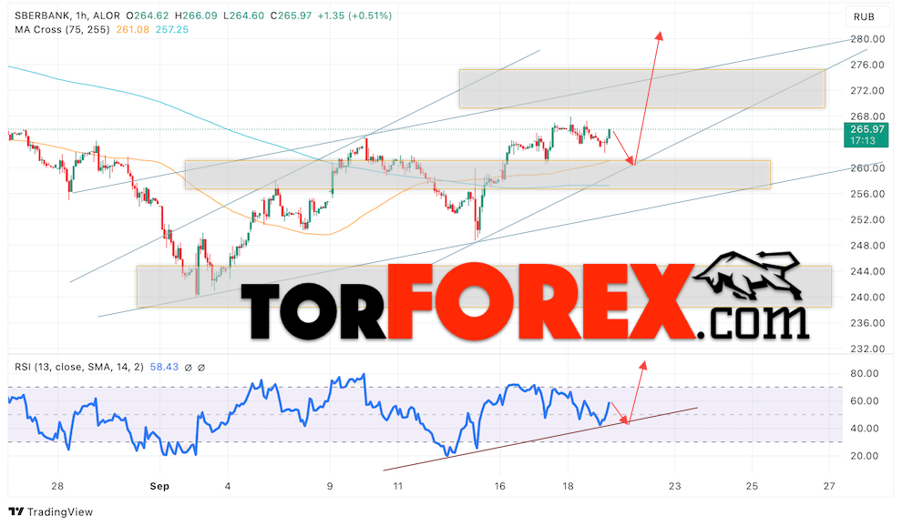 Дополнительным сигналом в пользу роста котировок SBER выступит тест линии поддержки на индикаторе относительной силы (RSI). Вторым сигналом выступит отбой от нижней границы бычьего канала. Отменой варианта роста стоимости акций Сбербанк станет падение стоимости бумаг и пробой уровня 255. Это укажет на пробой поддержки и продолжение падения акций в область ниже уровня 235. Ожидать подтверждения росту котировок SBER стоит с пробоем области сопротивления и закрытием выше уровня 270.