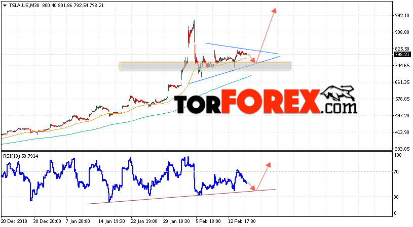 Дополнительным сигналом в пользу роста котировок Tesla выступит тест линии поддержки на индикаторе относительной силы (RSI). Вторым сигналом станет отскок от нижней границы модели «Треугольник». Отменой варианта роста котировок стоимости акций компании Tesla станет падение и пробой уровня 665.05. Это укажет на пробой области поддержки и продолжение падения в область на уровне 495.05. Ожидать ускорения роста акций стоит с пробоем области сопротивления и закрытием выше уровня 865.00, что укажет на выход цен за пределы модели «Треугольник».