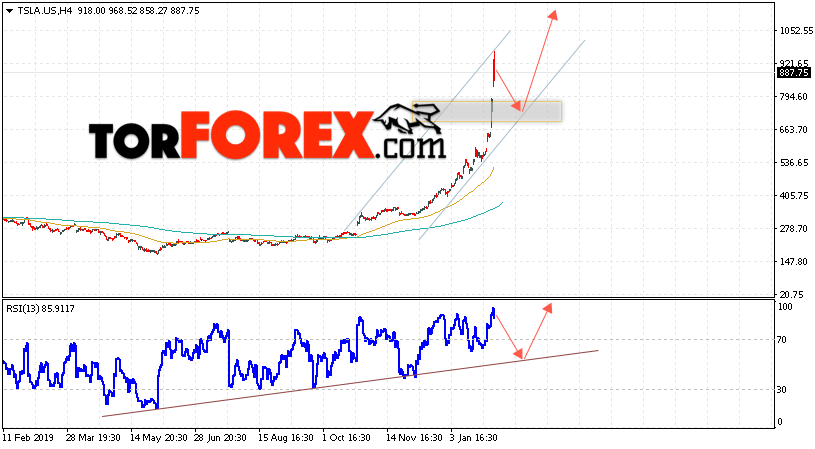 Дополнительным сигналом в пользу роста котировок Tesla выступит тест линии поддержки на индикаторе относительной силы (RSI). Вторым сигналом станет отскок от нижней границы восходящего канала. Отменой варианта роста котировок стоимости акций компании Tesla станет падение и пробой уровня 665.05. Это укажет на пробой области поддержки и продолжение падения в область на уровне 425.05, в этом случае стоит рассматривать формирования модели «V-образная формация». Ожидать ускорения роста акций стоит с пробоем области сопротивления и закрытием выше уровня 995.00.