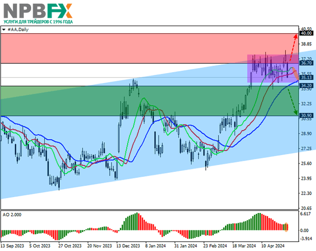 Акции Alcoa Corp., одного из крупнейших производителей алюминия, торгуются на отметке 35.00.