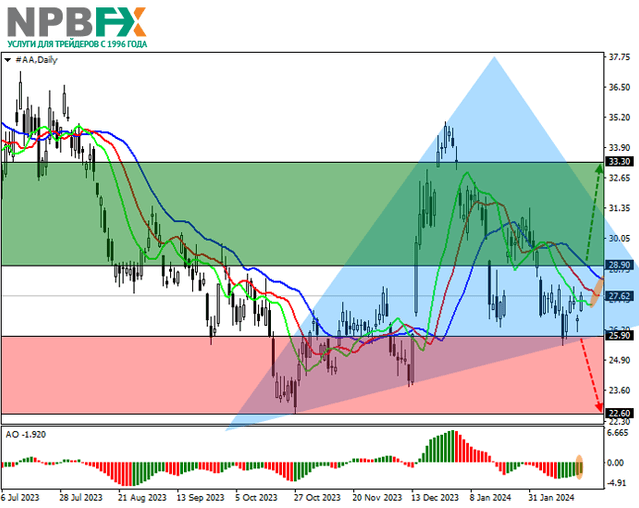 Акции Alcoa Corp., одного из крупнейших производителей алюминия, корректируются на отметке 27.00.