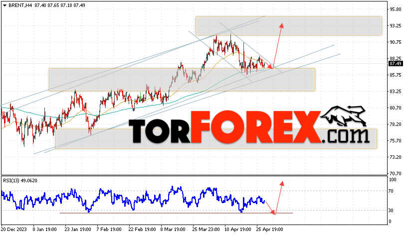 Дополнительным сигналом в пользу роста котировок и цен на нефть Brent выступит тест линии поддержки на индикаторе относительной силы (RSI). Вторым сигналом станет отбой от нижней границы бычьего канала. Отменой варианта роста цен на нефть станет падение цен и пробой уровня 82.45 долларов за баррель. Это укажет на пробой области поддержки и продолжение падения котировок BRENT в область ниже уровня 76.75. Подтверждением роста котировок и цен на нефть выступит пробой области сопротивления и закрытие цен на Brent выше уровня 90.05, что укажет на пробой верхней границы медвежьего канала коррекции.