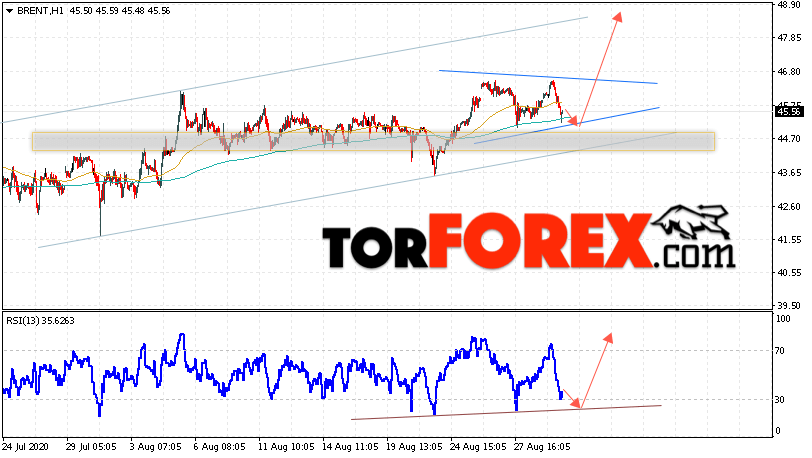 Дополнительным сигналом в пользу роста котировок и цен на нефть Brent выступит тест линии тренда на индикаторе относительной силы (RSI). Вторым сигналом станет отскок от верхней границы нисходящего канала. Отменой варианта роста цен на нефть станет падение и пробой уровня 43.55 долларов за баррель. Это укажет на пробой области поддержки и продолжение падения котировок BRENT в область ниже уровня 39.25. Подтверждением роста котировок выступит пробой уровня сопротивления и закрытие цен на Brent выше уровня 47.05, что укажет на пробой верхней границы модели «Треугольник».