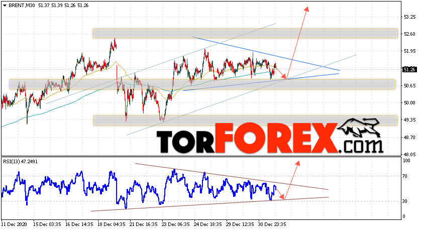 Дополнительным сигналом в пользу роста котировок и цен на нефть Brent выступит тест линии тренда на индикаторе относительной силы (RSI). Вторым сигналом станет отскок от нижней границы модели ”Треугольник”. Отменой варианта подъёма цен на нефть станет падение и пробой уровня 49.65 долларов за баррель. Это укажет на пробой области поддержки и продолжение падения котировок BRENT в область ниже уровня 46.75. Подтверждением роста котировок выступит пробой уровня сопротивления и закрытие цен на Brent выше уровня 52.35, что укажет на пробой верхней границы модели ”Треугольник”.