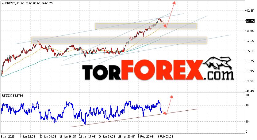 Дополнительным сигналом в пользу роста котировок и цен на нефть Brent выступит тест линии тренда на индикаторе относительной силы (RSI). Вторым сигналом станет отскок от нижней границы восходящего канала. Отменой варианта подъёма цен на нефть станет падение и пробой уровня 58.15 долларов за баррель. Это укажет на пробой области поддержки и продолжение падения котировок BRENT в область ниже уровня 53.55. Подтверждением роста котировок выступит пробой уровня сопротивления и закрытие цен на Brent выше уровня 62.55, что укажет на пробой верхней границы восходящего канала.