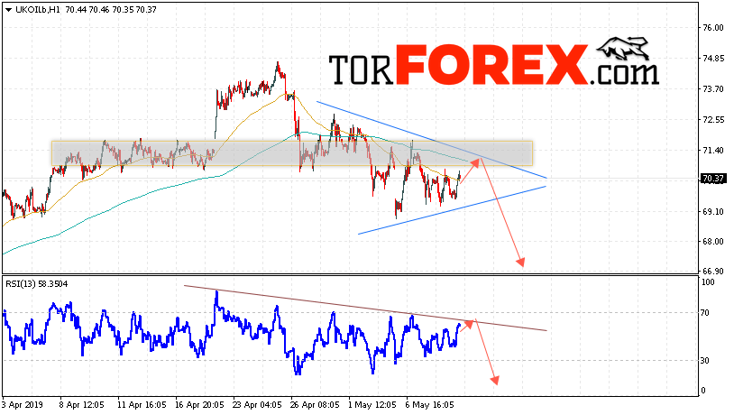 Таким образом, Аналитика и прогноз цен на нефть на 10 мая 2019 предполагает попытку теста уровня сопротивления вблизи области 71.25. Далее, продолжение падения с целью ниже уровня 66.90. В пользу снижения выступит тест линии тренда на индикаторе относительной силы. Отменой варианта падения цены нефти BRENT станет сильный рост и пробой уровня 72.25. Это укажет на продолжение подъёма котировок в область выше уровня 73.95.