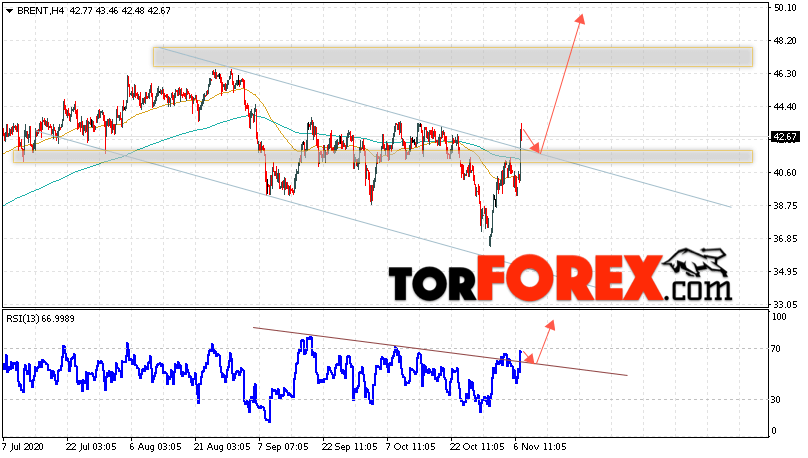 Таким образом, Аналитика и прогноз цен на нефть на 10 ноября 2020 предполагает попытку ниже уровня поддержки вблизи области 41.65. Далее, продолжение роста с целью выше уровня 49.05. В пользу подъёма выступит тест линии тренда на индикаторе относительной силы. Отменой варианта роста цены нефти Brent станет падение и пробой уровня 36.35. Это укажет на продолжение снижения котировок в область ниже уровня 27.05.