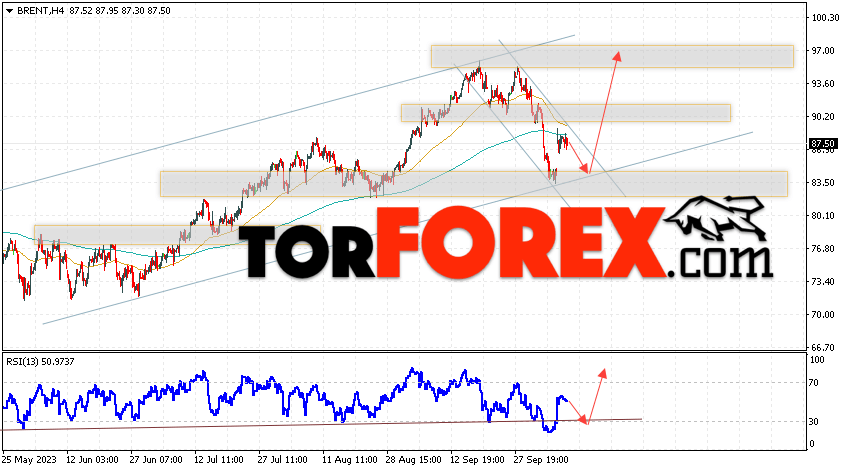 Дополнительным сигналом в пользу роста котировок и цен на нефть Brent выступит тест линии поддержки на индикаторе относительной силы (RSI). Вторым сигналом станет отбой от нижней границы бычьего канала. Отменой варианта роста цен на нефть станет падение и пробой уровня 80.65 долларов за баррель. Это укажет на пробой области поддержки и продолжение падения котировок BRENT в область ниже уровня 74.55. Подтверждением росту котировок и цен на нефть выступит пробой области сопротивления и закрытие цен на Brent выше уровня 90.05, что укажет на пробой верхней границы медвежьего канала коррекции.
