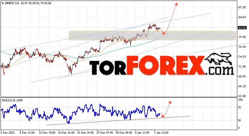 Котировки нефти марки Brent продолжают движение в рамках роста и бычьего канала. В момент публикации прогноза цена нефти марки Brent составляет 82.00 долларов за баррель. Скользящие средние указывают на наличие краткосрочной бычьей тенденции по нефти. Цены пробили область между сигнальными линиями вверх, что указывает на давление со стороны покупателей ”Черного Золота” и потенциальное продолжение роста стоимости актива уже с текущих уровней. На данный момент стоит ожидать попытку развития коррекции и тест уровня поддержки вблизи области 79.85 доллара за баррель. Далее, продолжение подъёма курса нефти в область выше уровня 88.45, однако пробой бычьего канала спровоцирует продолжение падения нефти в рамках начала отработки большой разворотной модели ”Голова и плечи” на дневном графике.