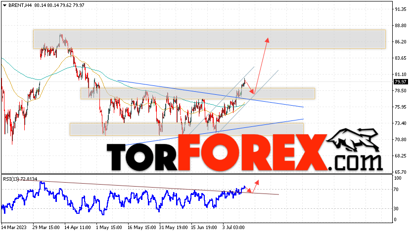Дополнительным сигналом в пользу роста котировок и цен на нефть Brent выступит тест линии поддержки на индикаторе относительной силы (RSI). Вторым сигналом станет отбой от верхней границы модели «Треугольник». Отменой варианта подъёма цен на нефть станет падение и пробой уровня 74.45 долларов за баррель. Это укажет на пробой области поддержки и продолжение падения котировок BRENT в область ниже уровня 67.55. Подтверждением росту котировок и цен на нефть выступит пробой области сопротивления и закрытие цен на Brent выше уровня 81.65.