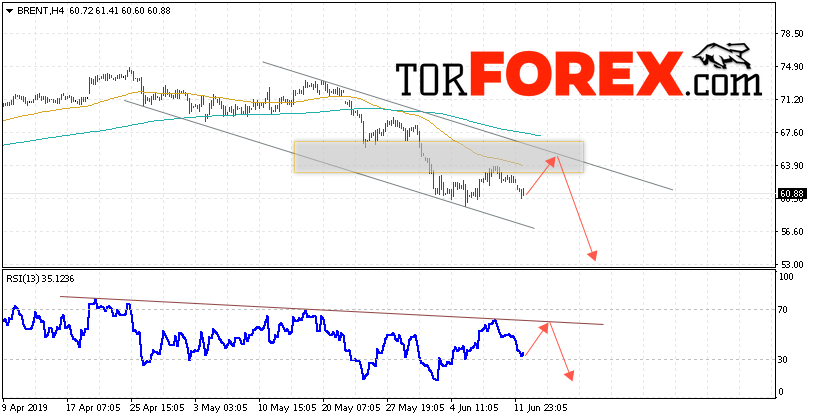 Таким образом, Аналитика и прогноз цен на нефть на 13 июня 2019 предполагает попытку теста уровня сопротивления вблизи области 63.95. Далее, продолжение падения с целью ниже уровня 53.05. В пользу снижения выступит тест линии тренда на индикаторе относительной силы. Отменой варианта падения цены нефти BRENT станет сильный рост и пробой уровня 66.95. Это укажет на продолжение подъёма котировок в область выше уровня 69.85.