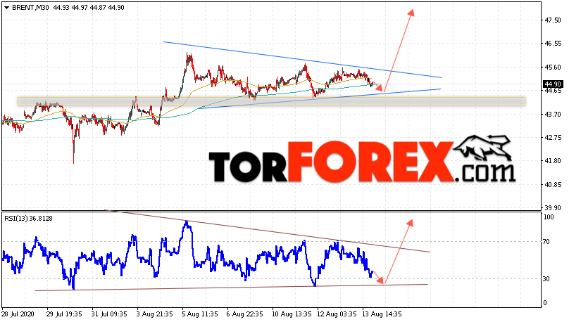 Таким образом, Аналитика и прогноз цен на нефть на 14 августа 2020 предполагает попытку теста уровня поддержки вблизи области 44.65. Далее, продолжение роста с целью выше уровня 48.25. В пользу подъёма выступит тест линии тренда на индикаторе относительной силы. Отменой варианта роста цены нефти Brent станет падение и пробой уровня 43.45. Это укажет на продолжение снижения котировок в область ниже уровня 40.15.