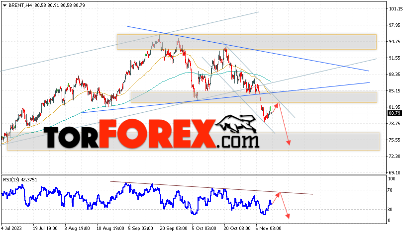 Дополнительным сигналом в пользу падения котировок и цен на нефть Brent выступит тест линии поддержки на индикаторе относительной силы (RSI). Вторым сигналом станет отбой от верхней границы медвежьего канала. Отменой варианта падения цен на нефть станет сильный рост цен и пробой уровня 87.45 долларов за баррель. Это укажет на пробой области сопротивления и продолжение роста котировок BRENT в область выше уровня 93.75. Подтверждением падению котировок и цен на нефть выступит пробой области поддержки и закрытие цен на Brent ниже уровня 77.05.