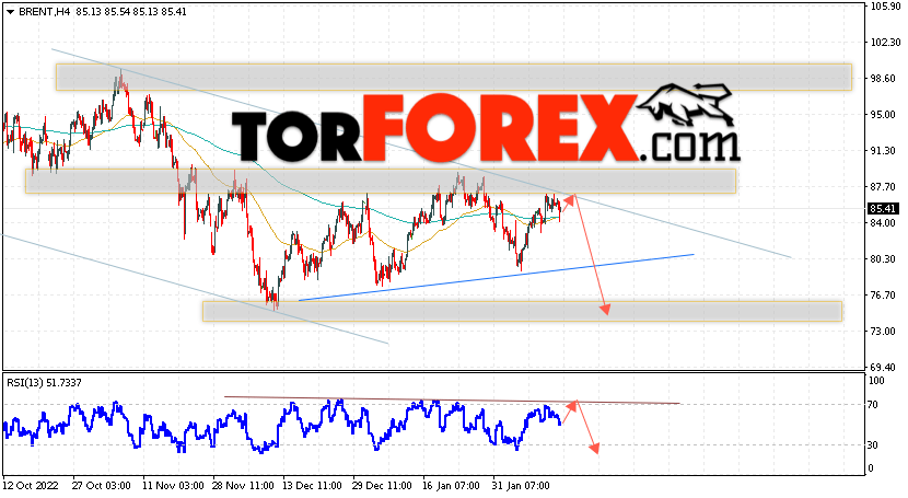 Котировки нефти марки Brent продолжают движение в рамках роста и формирования разворотной модели ”Голова и плечи”. В момент публикации прогноза цена нефти марки Brent составляет 85.41 долларов за баррель. Скользящие средние указывают на наличие краткосрочной медвежьей тенденции по нефти. Цены пробили область между сигнальными линиями вверх, что указывает на давление со стороны покупателей ”Черного Золота” и потенциальное продолжение роста стоимости актива уже с текущих уровней. На данный момент стоит ожидать попытку развития подъёма и тест уровня сопротивления вблизи области 86.65 долларов за баррель. Далее, отскок вниз и продолжение падения курса нефти в область ниже уровня 73.65.