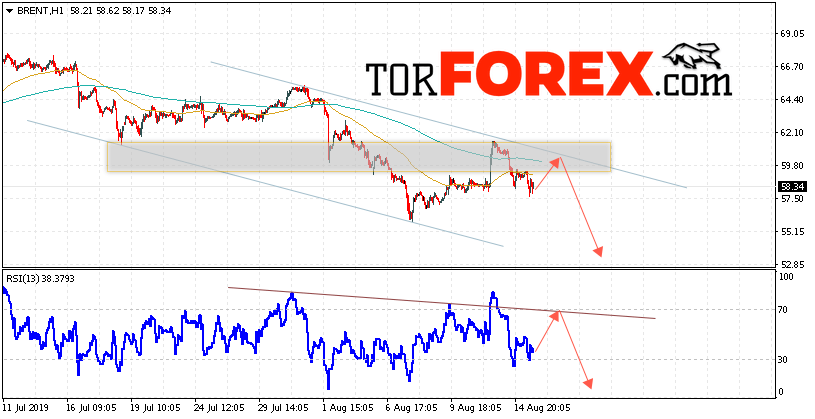 Таким образом, Аналитика и прогноз цен на нефть на 16 августа 2019 предполагает попытку теста уровня сопротивления вблизи области 59.95. Далее, продолжение падения с целью ниже уровня 52.85. В пользу снижения выступит тест линии тренда на индикаторе относительной силы. Отменой варианта падения цены нефти BRENT станет сильный рост и пробой уровня 62.15. Это укажет на продолжение подъёма котировок в область выше уровня 63.55.