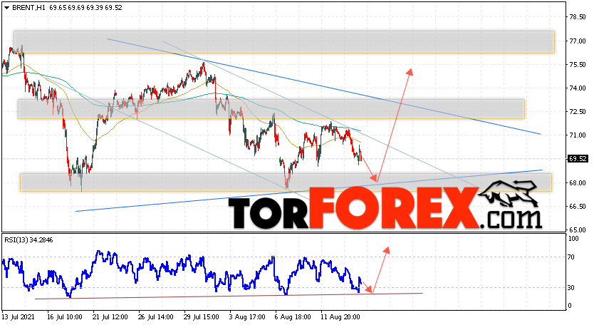 Дополнительным сигналом в пользу роста котировок и цен на нефть Brent выступит тест линии поддержки на индикаторе относительной силы (RSI). Вторым сигналом станет отскок от линии нижней границы модели ”Треугольник”. Отменой варианта подъёма цен на нефть станет падение и пробой уровня 65.55 долларов за баррель. Это укажет на пробой области поддержки и продолжение падения котировок BRENT в область ниже уровня 62.05. Подтверждением подъёма котировок выступит пробой уровня сопротивления и закрытие цен на Brent выше уровня 72.75, что укажет на пробой верхней границы нисходящего канала.