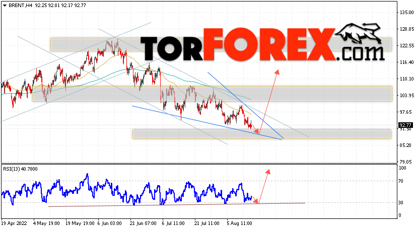Дополнительным сигналом в пользу роста котировок и цен на нефть Brent выступит тест линии поддержки на индикаторе относительной силы (RSI). Вторым сигналом станет отскок от нижней границы разворотной модели ”Клин”. Отменой варианта подъёма цен на нефть станет падение и пробой уровня 83.55 долларов за баррель. Это укажет на пробой области поддержки и продолжение падения котировок BRENT в область ниже уровня 75.05. Подтверждением росту котировок выступит пробой области сопротивления и закрытие цен на Brent выше уровня 100.55, что укажет на пробой верхней границы модели ”Клин” и начало отработки паттерна с целями вверху.