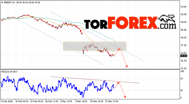 Таким образом, Аналитика и прогноз цен на нефть на 18 марта 2020 предполагает попытку теста уровня сопротивления вблизи области 33.65. Далее, продолжение падения с целью ниже уровня 19.95. В пользу снижения выступит тест линии тренда на индикаторе относительной силы. Отменой варианта падения цены нефти Brent станет сильный рост и пробой уровня 40.55. Это укажет на продолжение подъёма котировок в область выше уровня 45.45.