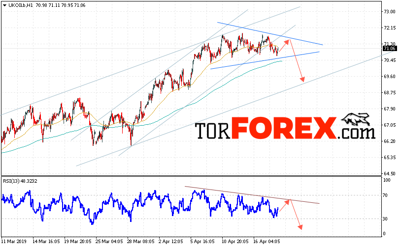 Таким образом, Аналитика и прогноз цен на нефть на 19 апреля 2019 предполагает попытку теста уровня сопротивления вблизи области 71.40. Далее, продолжение падения с целью ниже уровня 69.50. В пользу снижения выступит тест лини тренда на индикаторе относительной силы. Отменой варианта падения цены нефти BRENT станет сильный рост и пробой уровня 72.85. Это укажет на продолжение подъёма котировок в область выше уровня 75.65.