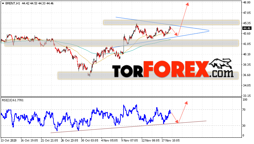 Дополнительным сигналом в пользу роста котировок и цен на нефть Brent выступит тест восходящей линии тренда на индикаторе относительной силы (RSI). Вторым сигналом станет отскок от нижней границы модели ”Треугольник”. Отменой варианта подъёма цен на нефть станет падение и пробой уровня 41.65 долларов за баррель. Это укажет на пробой области поддержки и продолжение падения котировок BRENT в область ниже уровня 37.25. Подтверждением роста котировок выступит пробой уровня сопротивления и закрытие цен на Brent выше уровня 46.25, что укажет на пробой верхней границы модели ”Треугольник”.