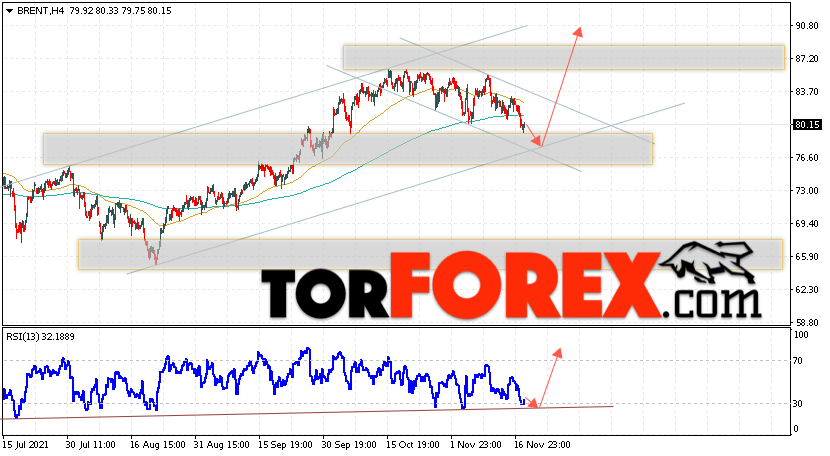 Дополнительным сигналом в пользу подъёма котировок и цен на нефть Brent выступит тест бычьей линии тренда на индикаторе относительной силы (RSI). Вторым сигналом станет пробой верхней границы нисходящего канала коррекции. Отменой варианта роста цен на нефть станет падение и пробой уровня 74.05 долларов за баррель. Это укажет на пробой области поддержки и продолжение снижения котировок BRENT в область ниже уровня 68.45. Подтверждением подъёма котировок выступит пробой уровня сопротивления и закрытие цен на Brent выше уровня 84.05, что укажет на пробой верхней границы канала коррекции.
