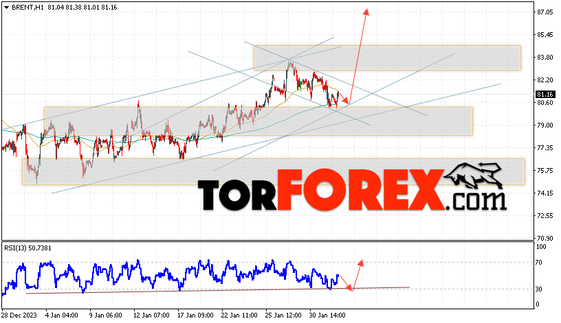 Дополнительным сигналом в пользу роста котировок и цен на нефть Brent выступит тест линии поддержки на индикаторе относительной силы (RSI). Вторым сигналом станет отбой от нижней границы бычьего канала. Отменой варианта роста цен на нефть станет падение цен и пробой уровня 78.05 долларов за баррель. Это укажет на пробой области поддержки и продолжение падения котировок BRENT в область ниже уровня 73.05. Подтверждением росту котировок и цен на нефть выступит пробой области сопротивления и закрытие цен на Brent выше уровня 84.05, что укажет на пробой верхней границы медвежьего канала коррекции.