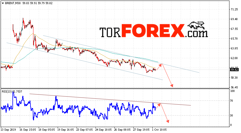 Таким образом, Аналитика и прогноз цен на нефть на 2 октября 2019 предполагает попытку теста уровня сопротивления вблизи области 60.25. Далее, продолжение падения с целью ниже уровня 56.55. В пользу снижения выступит тест линии тренда на индикаторе относительной силы. Отменой варианта падения цены нефти Brent станет сильный рост и пробой уровня 62.55. Это укажет на продолжение подъёма котировок в область выше уровня 67.85.