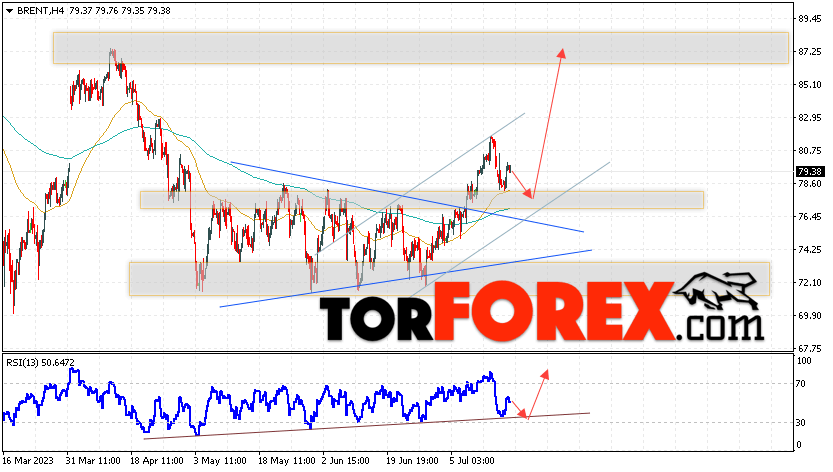 Дополнительным сигналом в пользу роста котировок и цен на нефть Brent выступит тест линии поддержки на индикаторе относительной силы (RSI). Вторым сигналом станет отбой от верхней границы модели «Треугольник». Отменой варианта подъёма цен на нефть станет падение и пробой уровня 73.05 долларов за баррель. Это укажет на пробой области поддержки и продолжение падения котировок BRENT в область ниже уровня 66.45. Подтверждением росту котировок и цен на нефть выступит пробой области сопротивления и закрытие цен на Brent выше уровня 82.55.