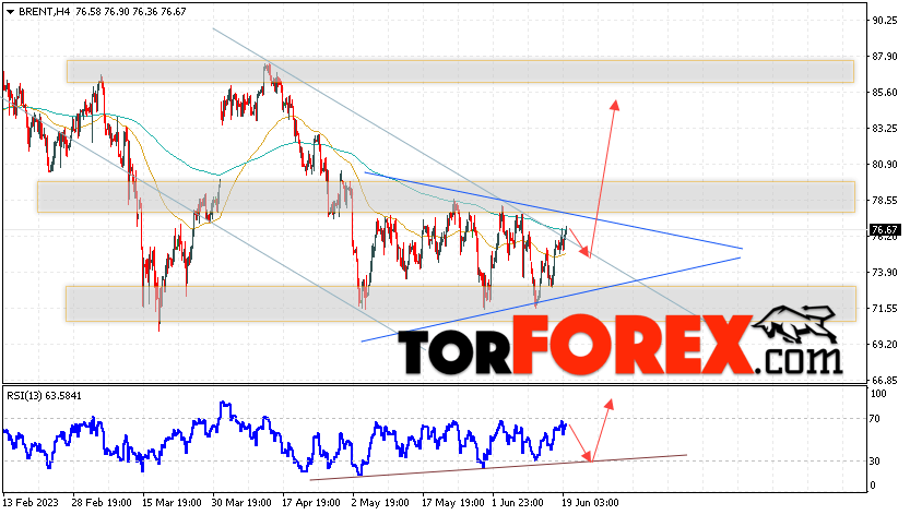 Дополнительным сигналом в пользу роста котировок и цен на нефть Brent выступит тест линии поддержки на индикаторе относительной силы (RSI). Вторым сигналом станет отбой от верхней границы нисходящего канала, который был пробит покупателями вверх. Отменой варианта роста цен на нефть станет падение и пробой уровня 71.05 долларов за баррель. Это укажет на пробой области поддержки и продолжение падения котировок BRENT в область ниже уровня 64.05. Подтверждением росту котировок и цен на нефть выступит пробой области сопротивления и закрытие цен на Brent выше уровня 79.05, что укажет на пробой верхней границы модели «Треугольник» и начало отработки паттерна с целями вверху.