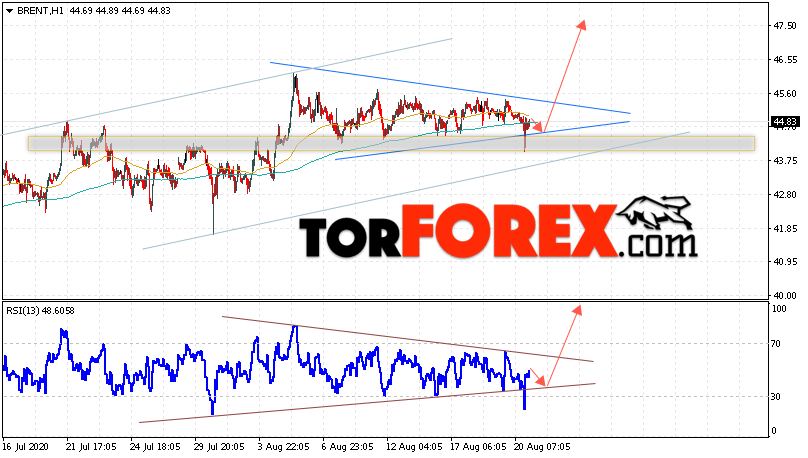 Таким образом, Аналитика и прогноз цен на нефть на 21 августа 2020 предполагает попытку теста уровня поддержки вблизи области 44.55. Далее, продолжение роста с целью выше уровня 47.65. В пользу подъёма выступит тест линии тренда на индикаторе относительной силы. Отменой варианта роста цены нефти Brent станет падение и пробой уровня 43.25. Это укажет на продолжение снижения котировок в область ниже уровня 39.05.