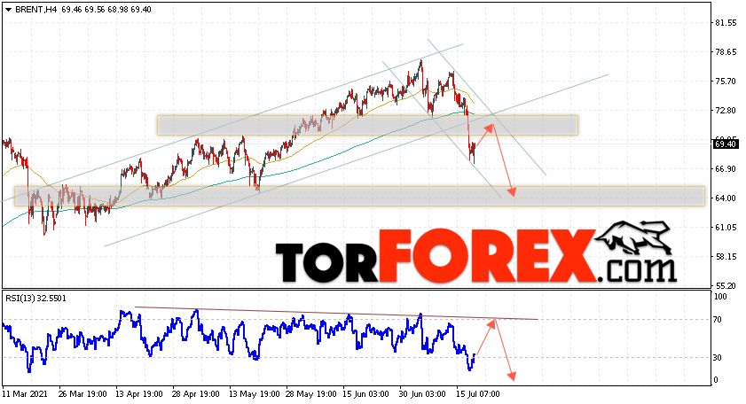 Таким образом, Аналитика и прогноз цен на нефть на 21 июля 2021 предполагает попытку теста уровня сопротивления вблизи области 71.45. Далее, продолжение падения с целью ниже уровня 64.05. В пользу падения выступит тест линии тренда на индикаторе относительной силы. Отменой варианта снижения цены нефти Brent станет сильный рост и пробой уровня 74.55. Это укажет на продолжение подъёма котировок в область выше уровня 79.75.