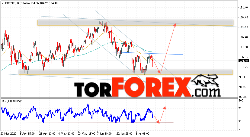Дополнительным сигналом в пользу подъёма котировок и цен на нефть Brent выступит тест линии поддержки на индикаторе относительной силы (RSI). Вторым сигналом станет отскок от нижней границы разворотной модели ”Голова и плечи”. Отменой варианта роста цен на нефть станет падение и пробой уровня 91.05 долларов за баррель. Это укажет на пробой области поддержки и продолжение падения котировок BRENT в область ниже уровня 80.55. Подтверждением подъёму котировок выступит пробой верхней границы медвежьего канала и закрытие цен на Brent выше уровня 110.05, что укажет на пробой верхней границы разворотной модели ”Голова и плечи”.