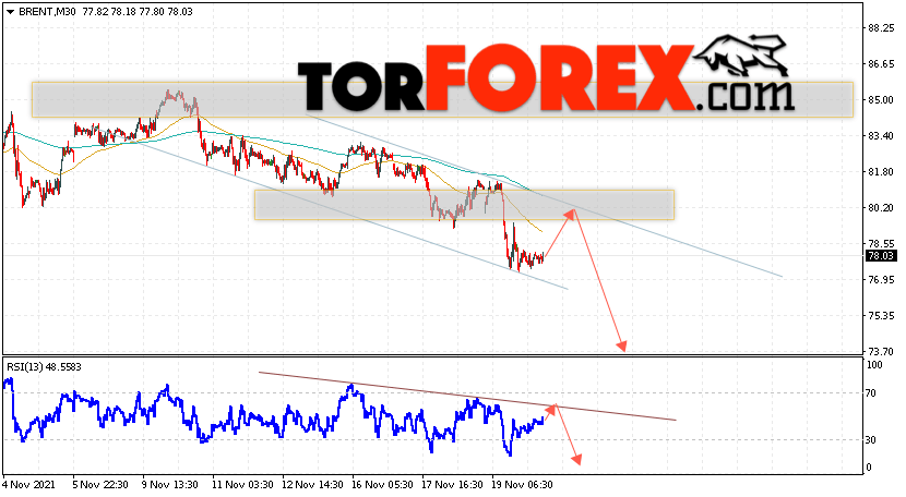 Дополнительным сигналом в пользу падения котировок и цен на нефть Brent выступит тест нисходящей линии тренда на индикаторе относительной силы (RSI). Вторым сигналом станет отскок от верхней границы нисходящего канала. Отменой варианта падения цен на нефть станет сильный рост и пробой уровня 81.95 долларов за баррель. Это укажет на пробой области сопротивления и продолжение подъёма котировок BRENT в область выше уровня 85.65. Подтверждением падения котировок выступит пробой уровня поддержки и закрытие цен на Brent ниже уровня 76.45.