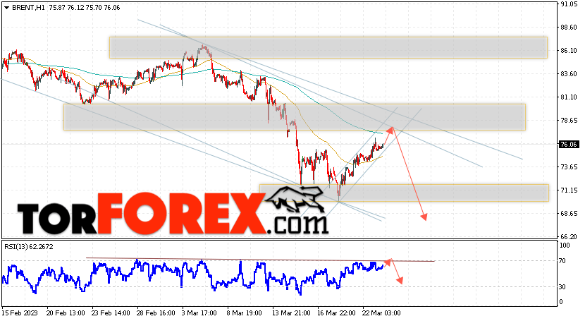 Дополнительным сигналом в пользу падения котировок и цен на нефть Brent выступит тест линии сопротивления на индикаторе относительной силы (RSI). Вторым сигналом станет отбой от верхней границы нисходящего канала. Отменой варианта падения цен на нефть станет сильный рост и пробой уровня 82.05 долларов за баррель. Это укажет на пробой области сопротивления и продолжение роста котировок BRENT в область выше уровня 87.55. Подтверждением падению котировок выступит пробой области поддержки и закрытие цен на Brent ниже уровня 73.55, что укажет на пробой нижней границы бычьего канала.