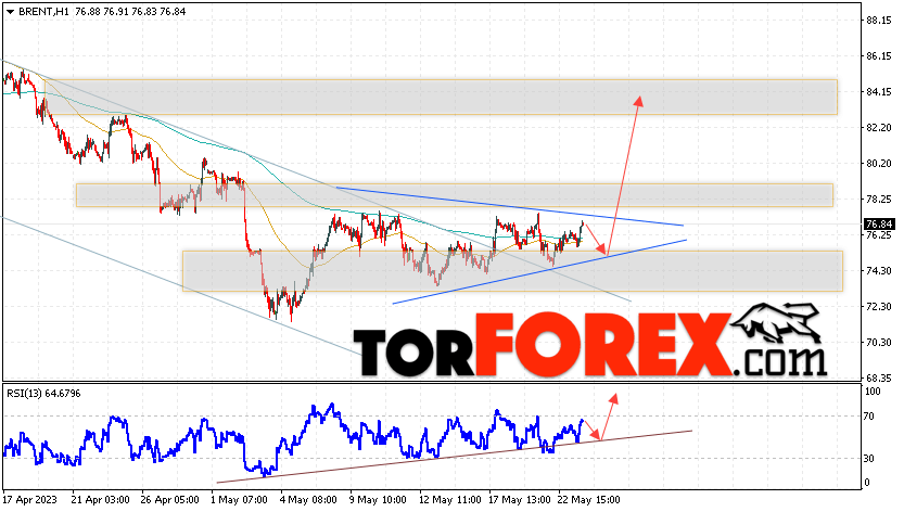 Дополнительным сигналом в пользу подъёма котировок и цен на нефть Brent выступит тест линии поддержки на индикаторе относительной силы (RSI). Вторым сигналом станет отбой от нижней границы модели «Треугольник». Отменой варианта роста цен на нефть станет падение и пробой уровня 69.85 долларов за баррель. Это укажет на пробой области поддержки и продолжение падения котировок BRENT в область ниже уровня 65.25. Подтверждением росту котировок выступит пробой области сопротивления и закрытие цен на Brent выше уровня 79.95, что укажет на пробой верхней границы модели «Треугольник» и начало отработки модели с целями вверху.