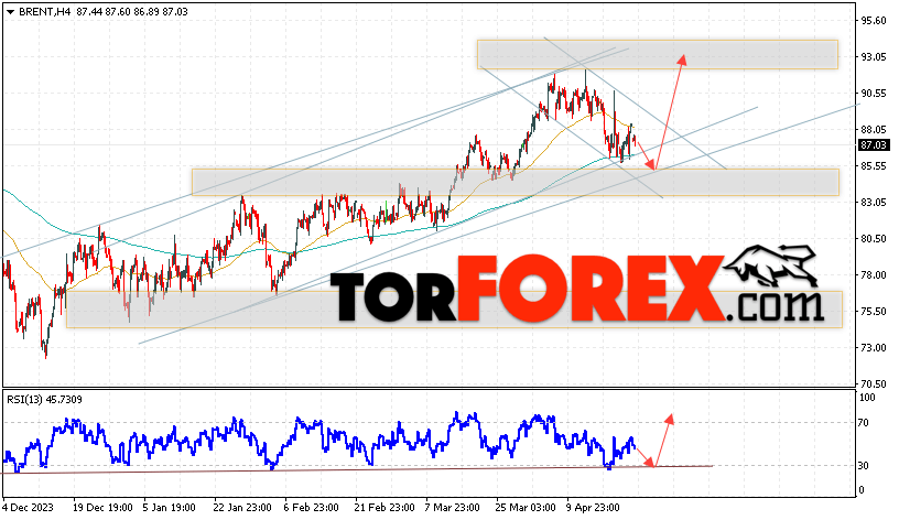 Дополнительным сигналом в пользу роста котировок и цен на нефть Brent выступит тест линии поддержки на индикаторе относительной силы (RSI). Вторым сигналом станет отбой от нижней границы разворотной модели «Клин». Отменой варианта роста цен на нефть станет падение цен и пробой уровня 82.05 долларов за баррель. Это укажет на пробой области поддержки и продолжение падения котировок BRENT в область ниже уровня 75.65. Подтверждением роста котировок и цен на нефть выступит пробой области сопротивления и закрытие цен на Brent выше уровня 90.05, что укажет на пробой верхней границы разворотной модели «Клин» и начало отработки паттерна с целями вверху.