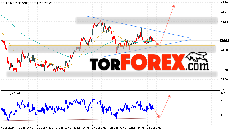 Дополнительным сигналом в пользу роста котировок и цен на нефть Brent выступит тест линии тренда на индикаторе относительной силы (RSI). Вторым сигналом станет отскок нижней границы модели ”Треугольник». Отменой варианта подъёма цен на нефть станет падение и пробой уровня 40.05 долларов за баррель. Это укажет на пробой области поддержки и продолжение падения котировок BRENT в область ниже уровня 36.55. Подтверждением роста котировок выступит пробой уровня сопротивления и закрытие цен на Brent выше уровня 43.05, что укажет на пробой верхней границы модели ”Треугольник”.