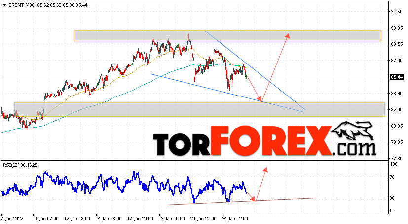 Дополнительным сигналом в пользу подъёма котировок и цен на нефть Brent выступит тест линии тренда на индикаторе относительной силы (RSI). Вторым сигналом станет отскок от нижней границы разворотной модели ”Клин”. Отменой варианта роста цен на нефть станет падение и пробой уровня 78.25 долларов за баррель. Это укажет на пробой области сопротивления и продолжение снижения котировок BRENT в область ниже уровня 75.05. Подтверждением подъёму котировок выступит пробой области сопротивления и закрытие цен на Brent выше уровня 87.05, что укажет на пробой верхней границы границы модели ”Клин”.