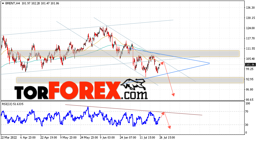 Котировки нефти марки Brent продолжают движение в рамках падения и нисходящего канала. Сохраняется потенциал для формирования модели ”Треугольник”, пробой которой вниз укажет на ускорение развития нисходящего импульса. В момент публикации прогноза цена нефти марки Brent составляет 101.86 долларов за баррель. Скользящие средние указывают на наличие краткосрочной медвежьей тенденции по нефти. Цены пробили область между сигнальными линиями вниз, что указывает на давление со стороны продавцов ”Черного Золота” и потенциальное продолжение падения стоимости актива уже с текущих уровней. На данный момент стоит ожидать попытку развития роста и тест уровня сопротивления вблизи области 102.25 долларов за баррель. Далее, отскок вниз и продолжение падения курса нефти в область ниже уровня 85.05.