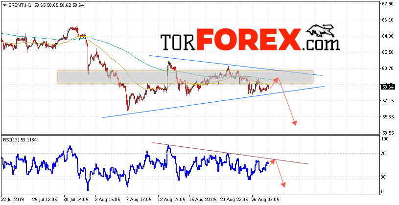 Таким образом, Аналитика и прогноз цен на нефть на 28 августа 2019 предполагает попытку теста уровня сопротивления вблизи области 59.55. Далее, продолжение падения с целью ниже уровня 53.75. В пользу снижения выступит тест линии тренда на индикаторе относительной силы. Отменой варианта падения цены нефти Brent станет сильный рост и пробой уровня 62.35. Это укажет на продолжение подъёма котировок в область выше уровня 65.05.